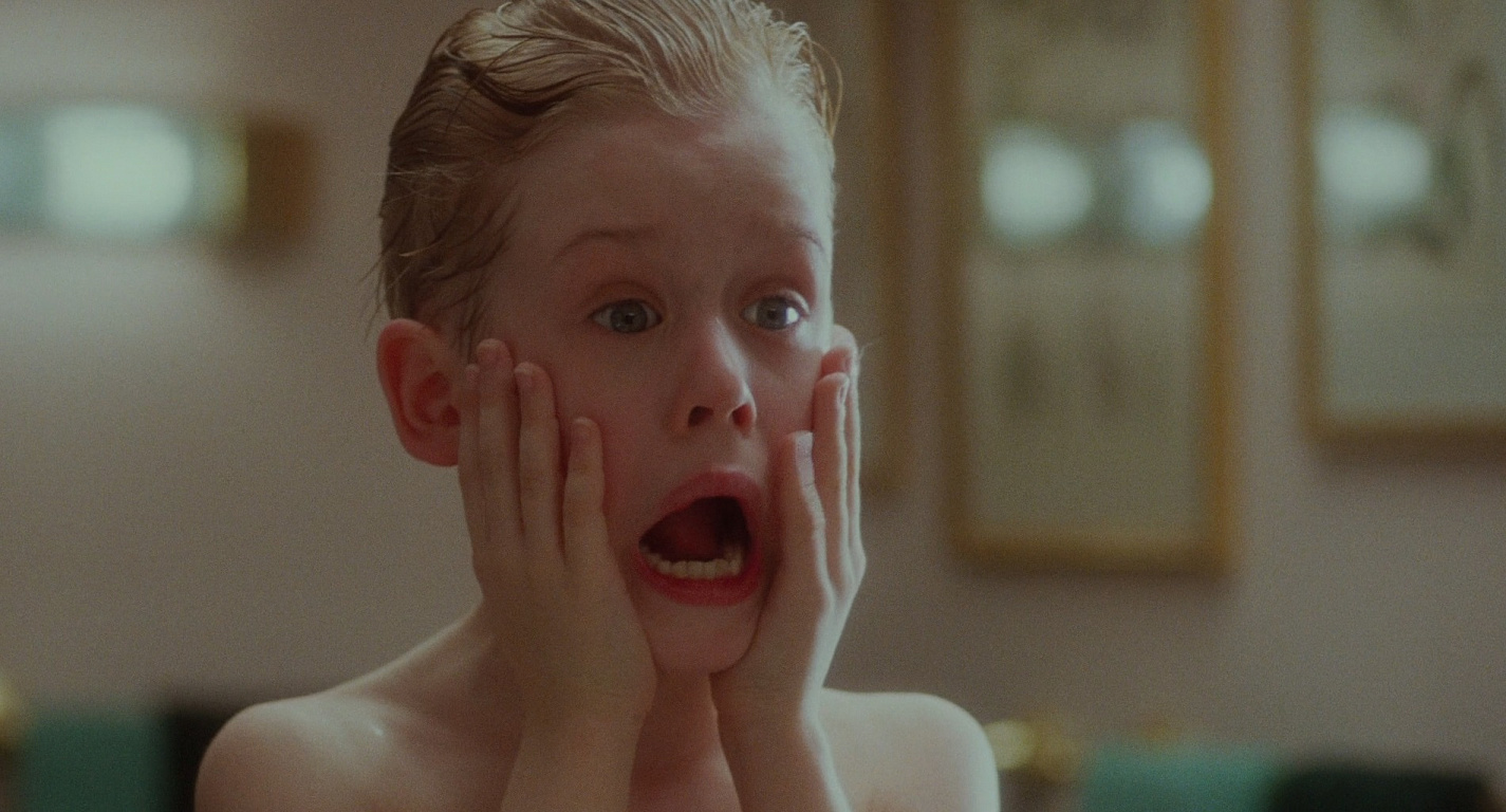 - Крик в сцене, где Кевин наносит на щёки одеколон, изначально планировался другим. Калкин должен был просто нанести немного одеколона и закричать. Вместо этого он всё время кричал, держа руки на лице, из‑за чего стал похож на знаменитую картину Эдварда Мунка «Крик». Крис Коламбус мгновенно оценил импровизацию, оставив этот дубль. Позднее кадр стал визитной карточкой фильма.