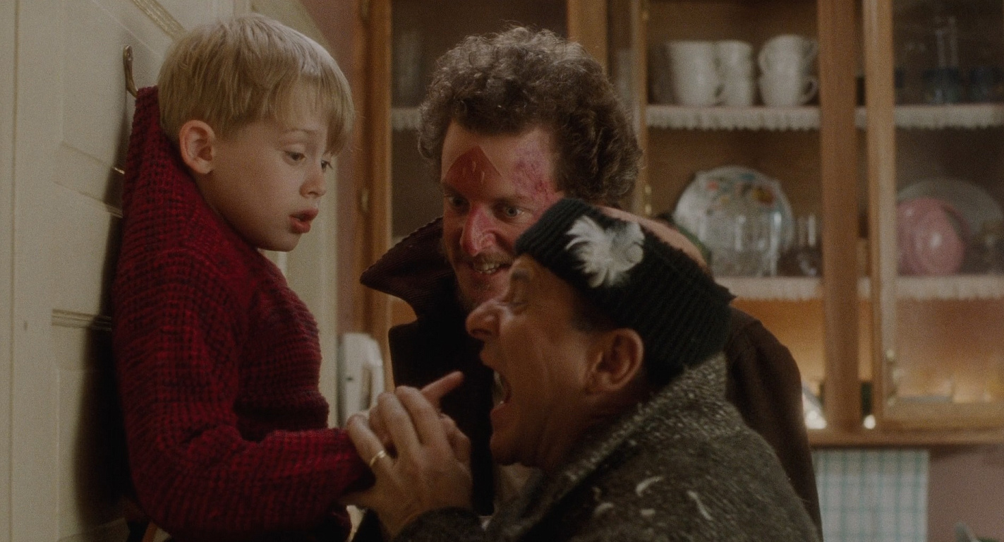 - Во время репетиций сцены, где Гарри в исполнении Джо Пеши вешает Кевина на крючок и угрожает откусить ему пальцы, актёр действительно укусил Калкина, оставив шрам. Вообще, Пеши вне съёмок старался держать с Маколеем дистанцию, чтобы юный актёр его боялся.
